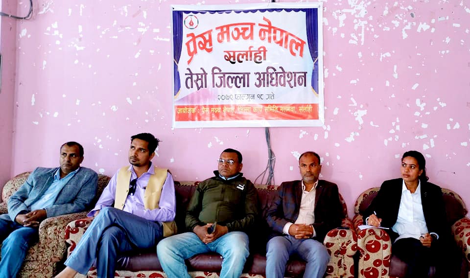 सर्लाही, १८ फागुन । प्रेस मञ्च नेपाल सर्लाही शाखाको तेस्रो जिल्ला अधिवेशन शनिबार जिल्लाको सदरमुकाम मलंगवामा सम्पन्न भएको छ । जिल्ला अध्यक्ष अनवर अहमदको अध्यक्षता तथा जसपा नेपाल प्रदेश उपाध्यक्ष रामपृत पासवानको प्रमुख आतिथ्यमा ९ सदस्यीय कार्य समिति चयन गरेकोछ । अध्यक्षमा पुनः अनवर अहमद, उपाध्यक्षमा रेखा यादव, सचिवमा कृष्णा सिहं र कोषाध्यक्षमा सदाम हुसैन सर्वसम्मत चयन गरेको छ ।