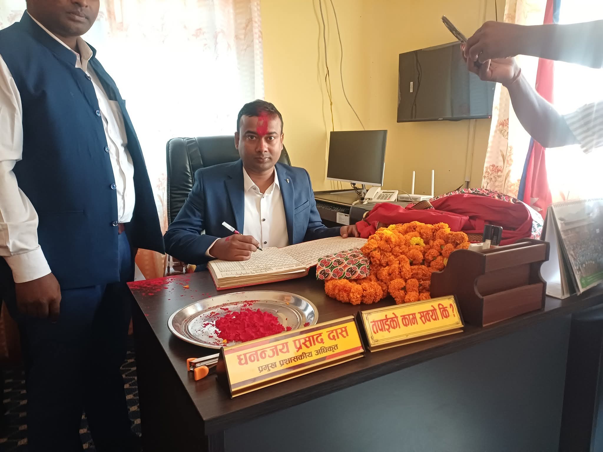 यहाँ करीब दुई वर्ष निमित्त प्रमुख प्रशासकीय अधिकृतको रुपमा सकुशल जिम्मेवारी निर्वाह गर्नुभएका उपेन्द्र राउतले अधिकृत दासलाई स्वागत गर्दै आगामी दिनहरुमा पनि हामी सहकार्य र समन्वयका साथ पालिका अगाडी बढाउने बताउनुभयो । अधिकृत दासले नियमसगंत तवरले ऐन कानुनको परिधीमा रही पालिकाको समुचित विकासमा आफुले हरसम्भव भुमिका निर्वाह गर्ने प्रतिवद्धता जाहेर गर्नुभयो । दास अधिकृत गोडैता नगरपालिका निवासी हुन् ।