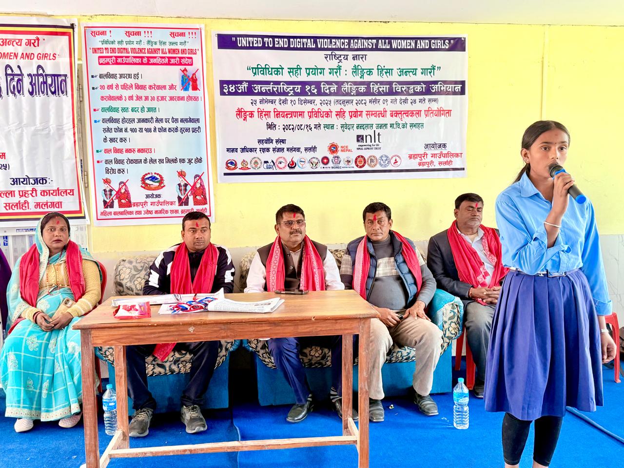 सर्लाही,१६ मंसिर । लैङ्गिक हिंसा विरुद्धको १६ दिने अभियान अन्तर्गत ब्रह्म्पुरी गाउँपालिकाले आज बक्तृत्वकला प्रतियोगीता समपन्न भएको छ । “प्रविधिको सहि प्रयोग गरौँः लैङ्गिक हिंसा अन्त्य गरौं” भन्ने मुल नाराका साथ सुरुवात भएको छ हरेक वर्ष नोभेम्बर २५ देखि डिसेम्बर १० सम्म विश्वभर मनाइने लैङ्गिक हिंसा विरुद्धको १६ दिने अभियान अन्तर्गत ब्रह्म्पुरी गाउँपालिकाको आयोजनामा लैङ्गिक हिंसा न्यूनिकरणमा प्रविधिको सहि प्रयोग विषयक बक्तृत्वकला प्रतियोगीता समपन्न भएको हो । गाउँपालिका उपाध्यक्ष श्यामकला यादवको अध्यक्षतमा समपन्न समपन्न भएको उक्त प्रतियोगीतामा श्री शिवन फूनिया जनतादेवी माध्यमिक विद्यालय, श्री सुवेदार नन्दलाल जनता माध्यमिक विद्यालय,श्री मधुर कुन्ति माया माध्यमिक विद्यालय,श्री जलधर कमलदेव नमुना माध्यमिक विद्यालय लगायतका विद्यालयका छात्रछात्राहरुले भाग लिएका थिए ।